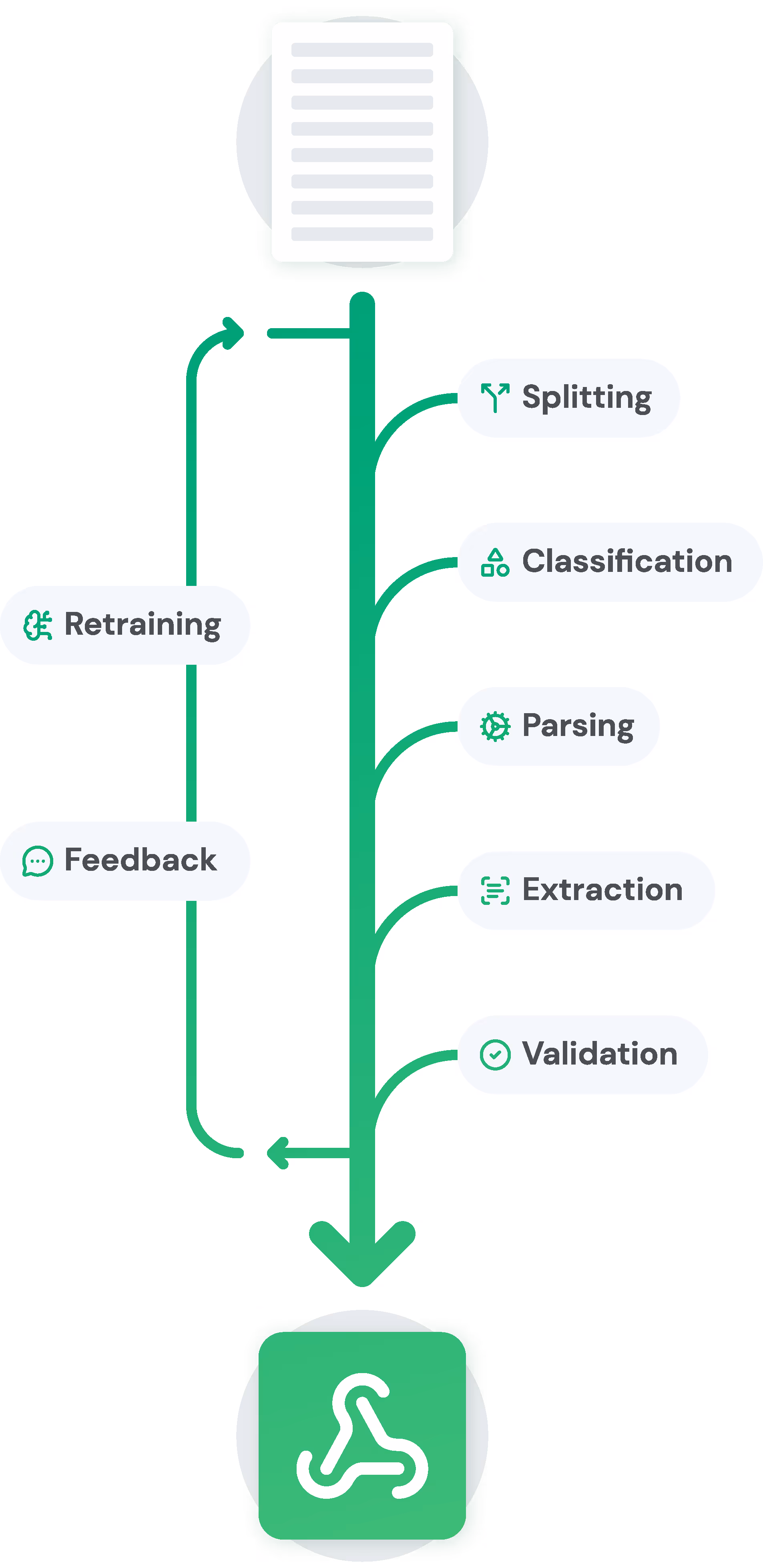 Ingestion, splitting, classification, parsing, extraction, validation, and delivery all flow through a single endpoint and webhook — no pipeline to build or maintain.